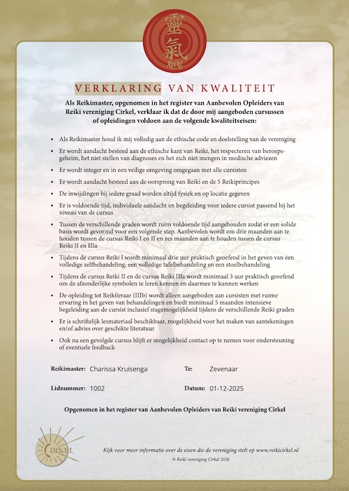 -> Je de cursus Reiki 1 en Reiki 2 hebt gedaan en de certificaten hebt behaald + 1 jaar als Reiki behandelaar hebt gewerkt.